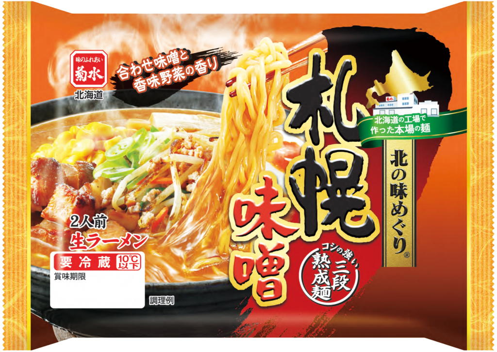 関東販売の札幌味噌ラーメンをダイナミックな箸持ちのシズルで伝えた。 何包装のアルミ地を生かして金色に見せることで特別感を付加した。