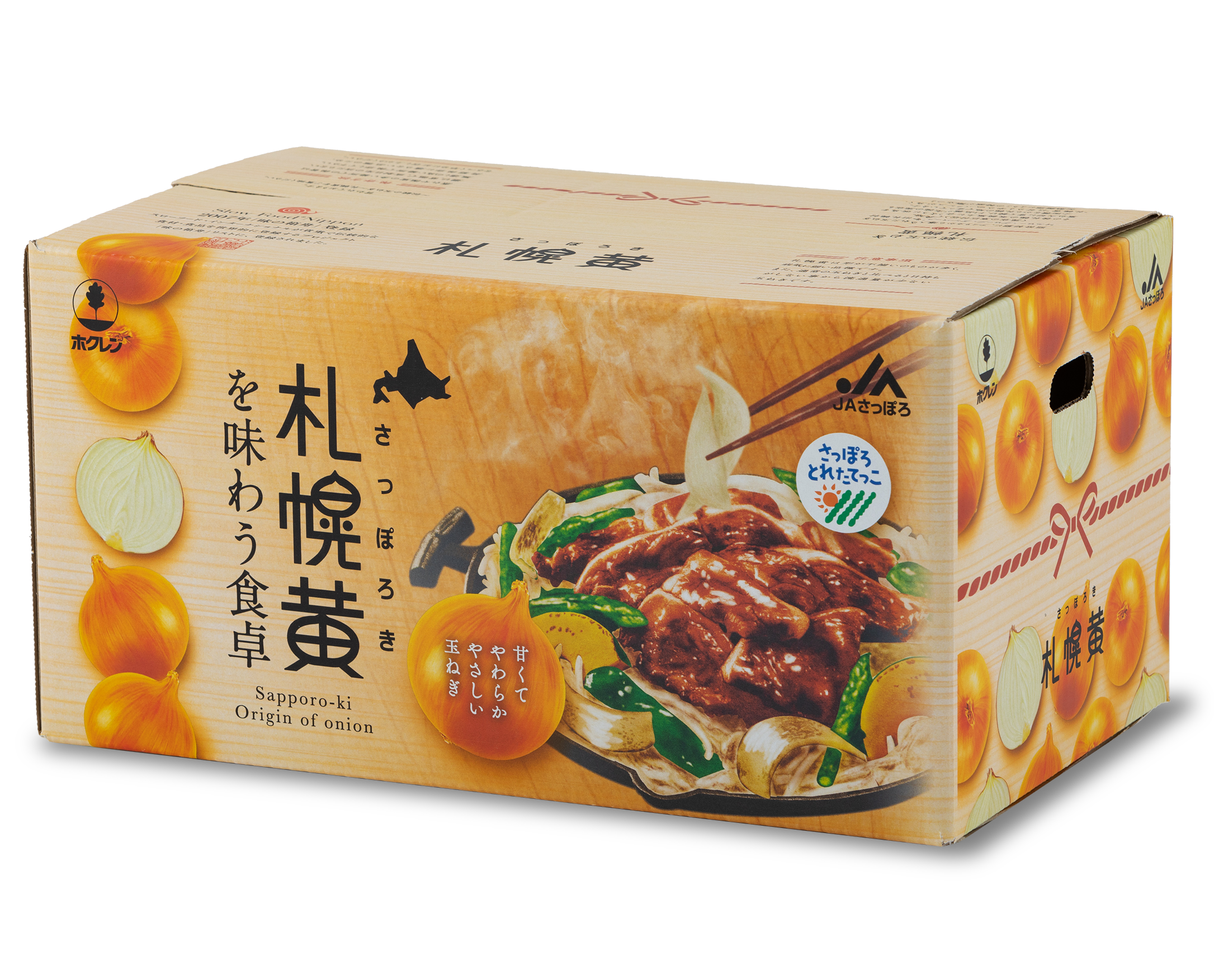 札幌の伝統野菜の札幌黄のパッケージ。流通で目立つようにジンギスカンの静流を大きく配置、玉ねぎがつながるデザインにした。